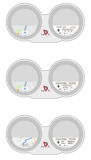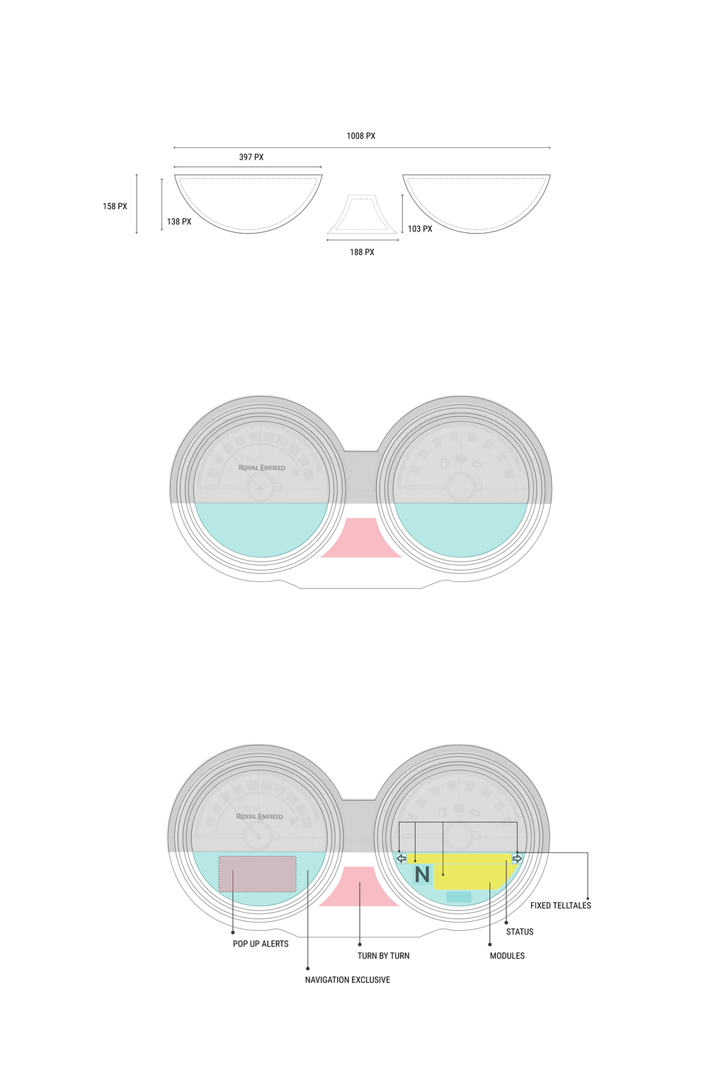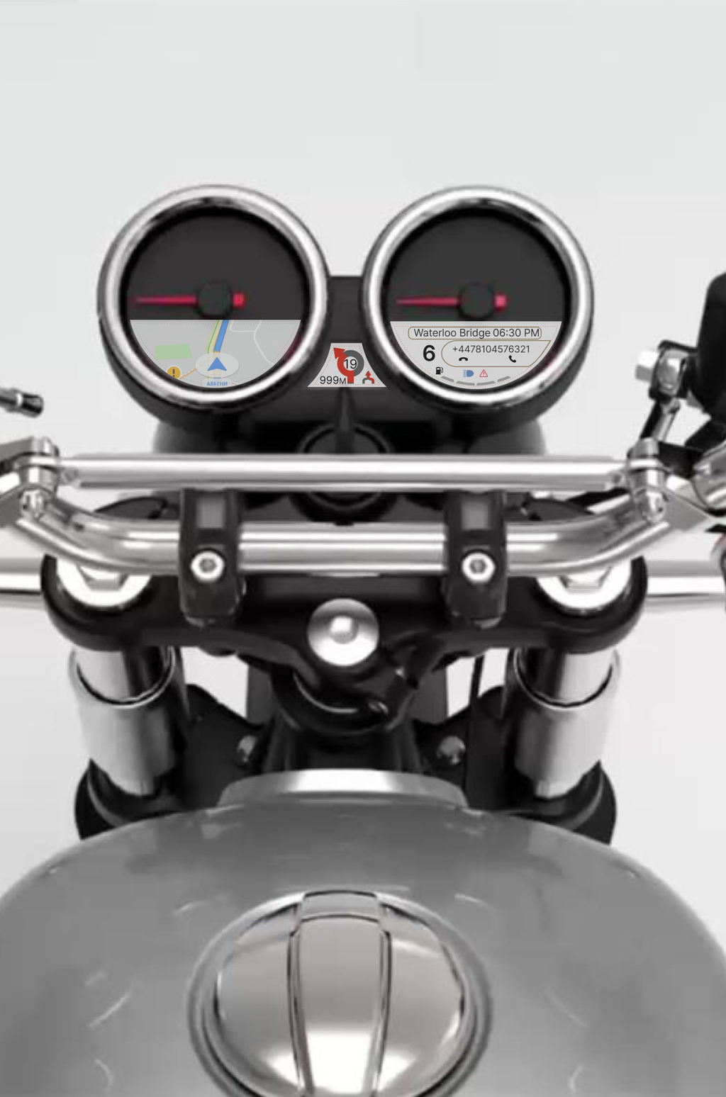 Now, we have a new challenge (Motorcycle Model 2). Royal Enfield wanted something different. Instead of one round screen, we worked on two half-circle screens with a small, trapezoidal centrepiece. The left screen shows the Google GPS navigation. The right screen was an interactive hub for various motorcycle features riders need to have.